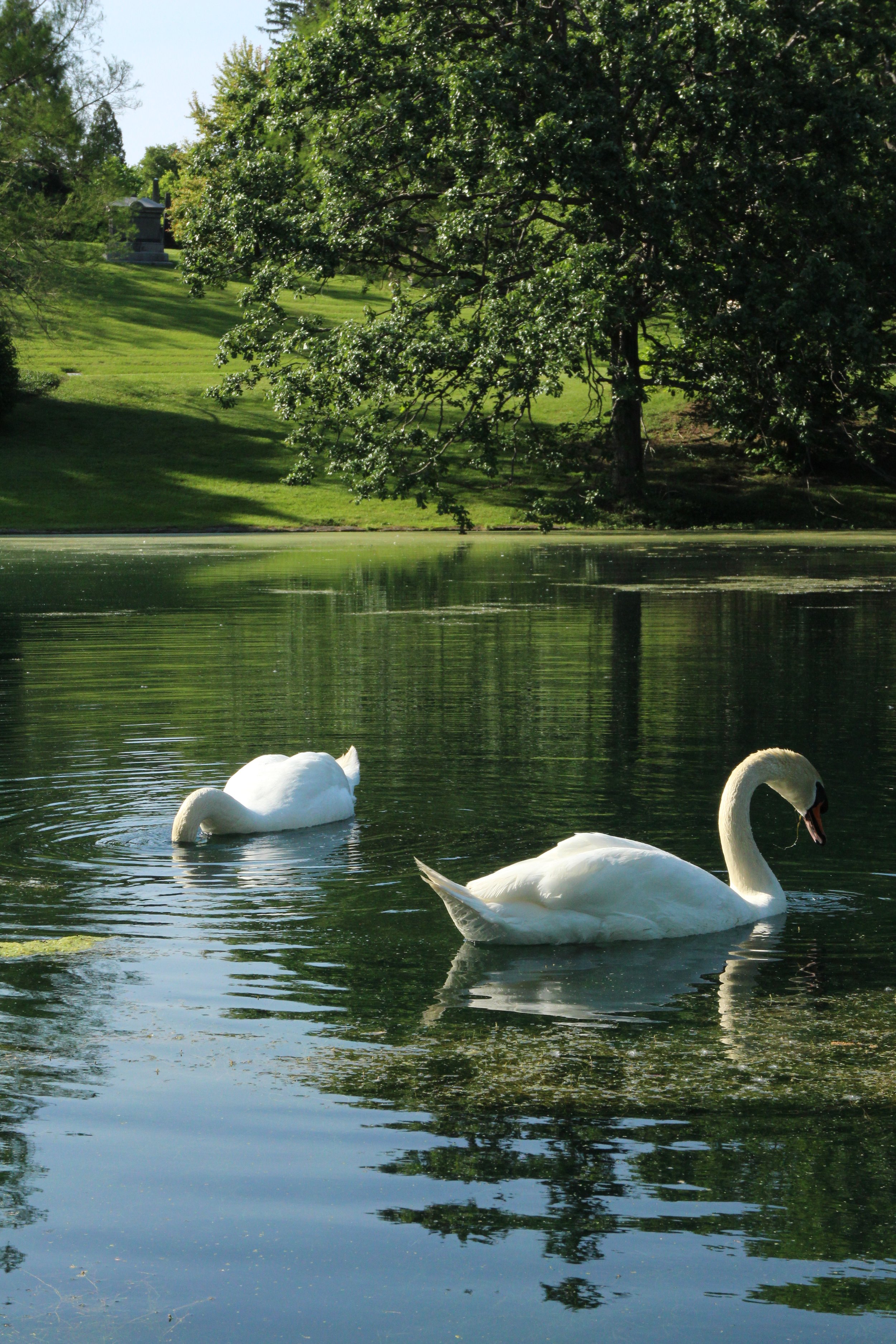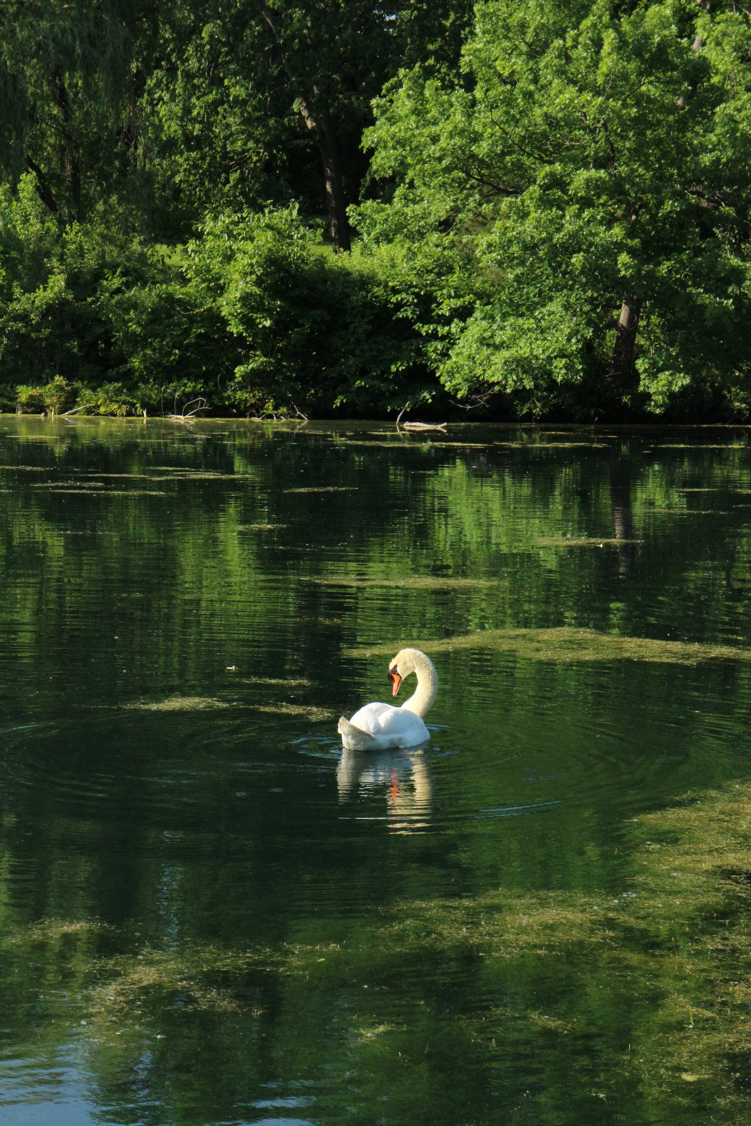 A white swan swimming in a calm body of water with lush green trees and bushes in the background.