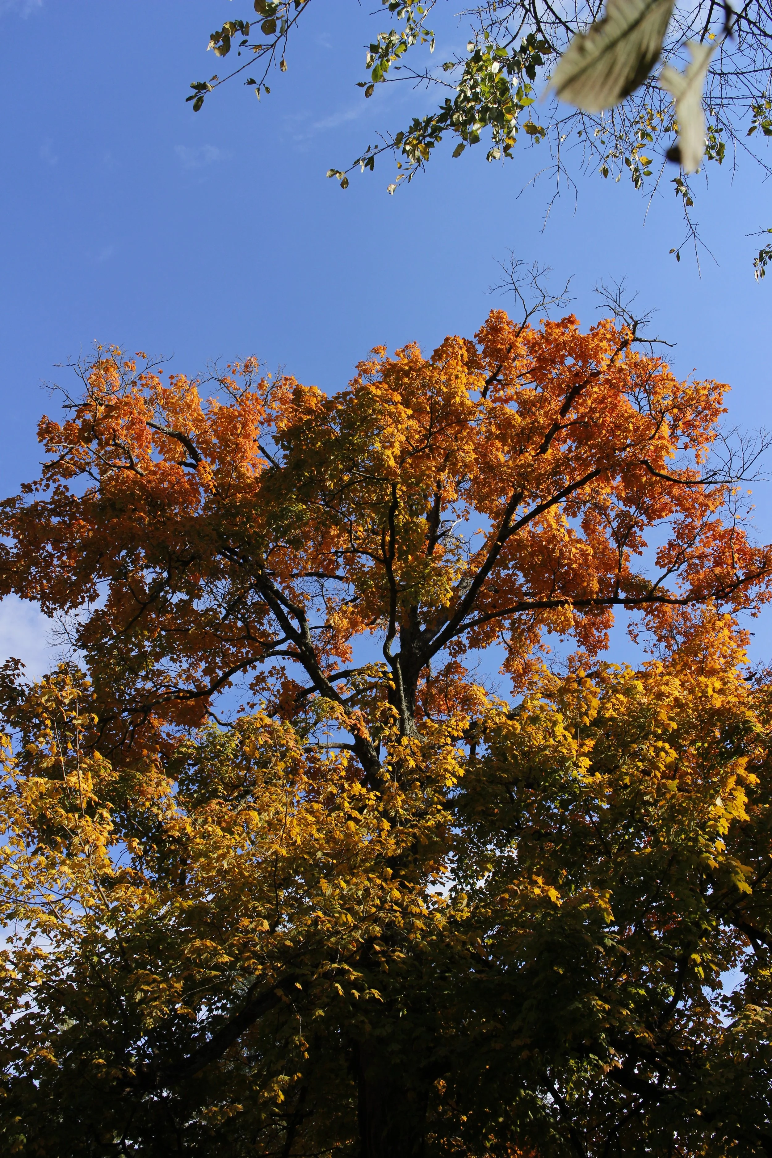 Fall trees with orange and yellow leaves under a bright blue sky.