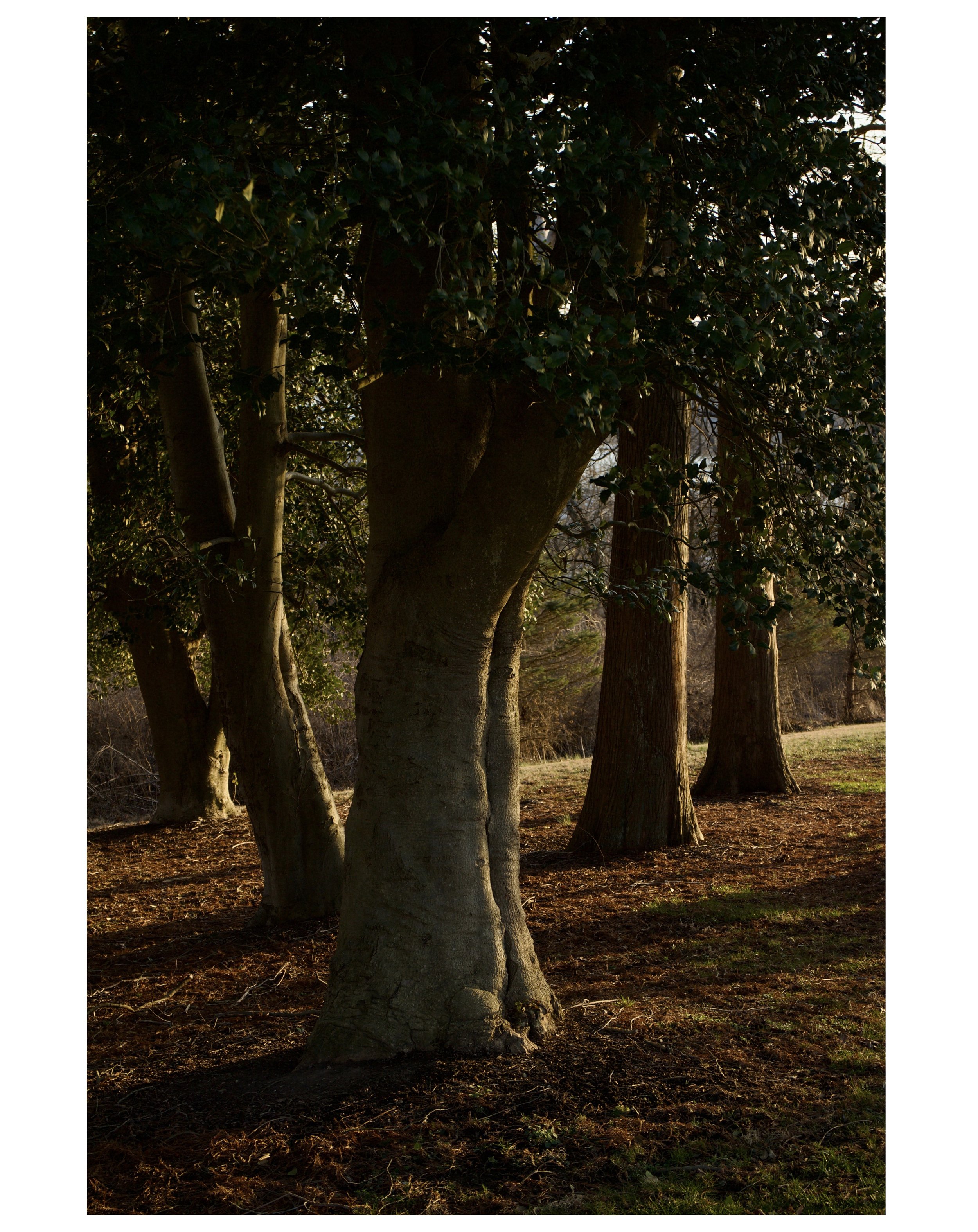 A group of trees in a forest during sunset or sunrise, with sunlight casting shadows on the ground.