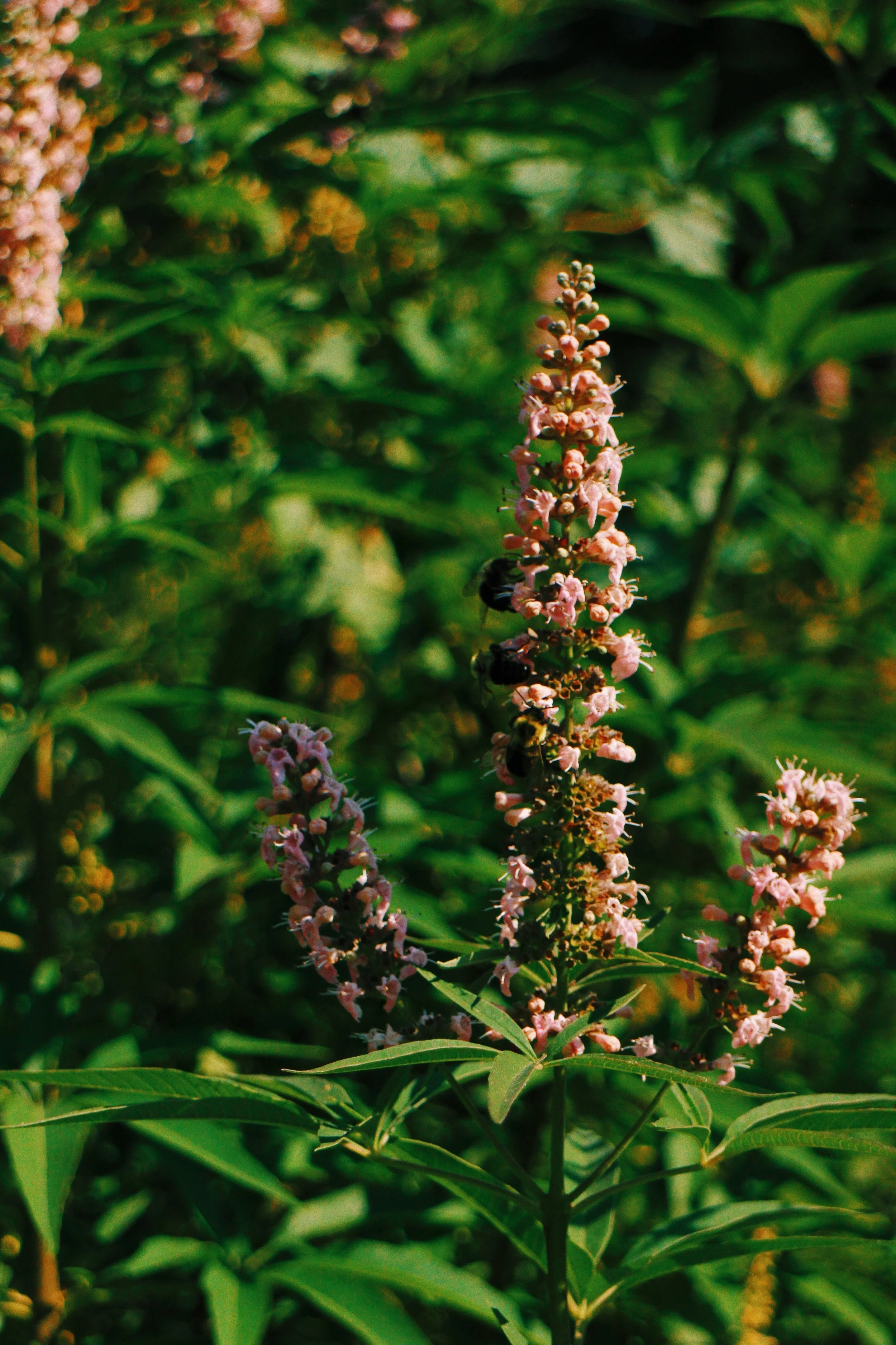 Close-up of a pink flower spike with green leaves, with bees collecting nectar.