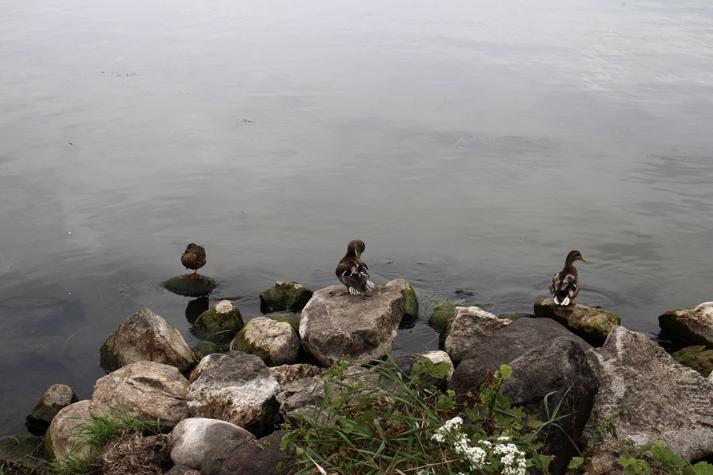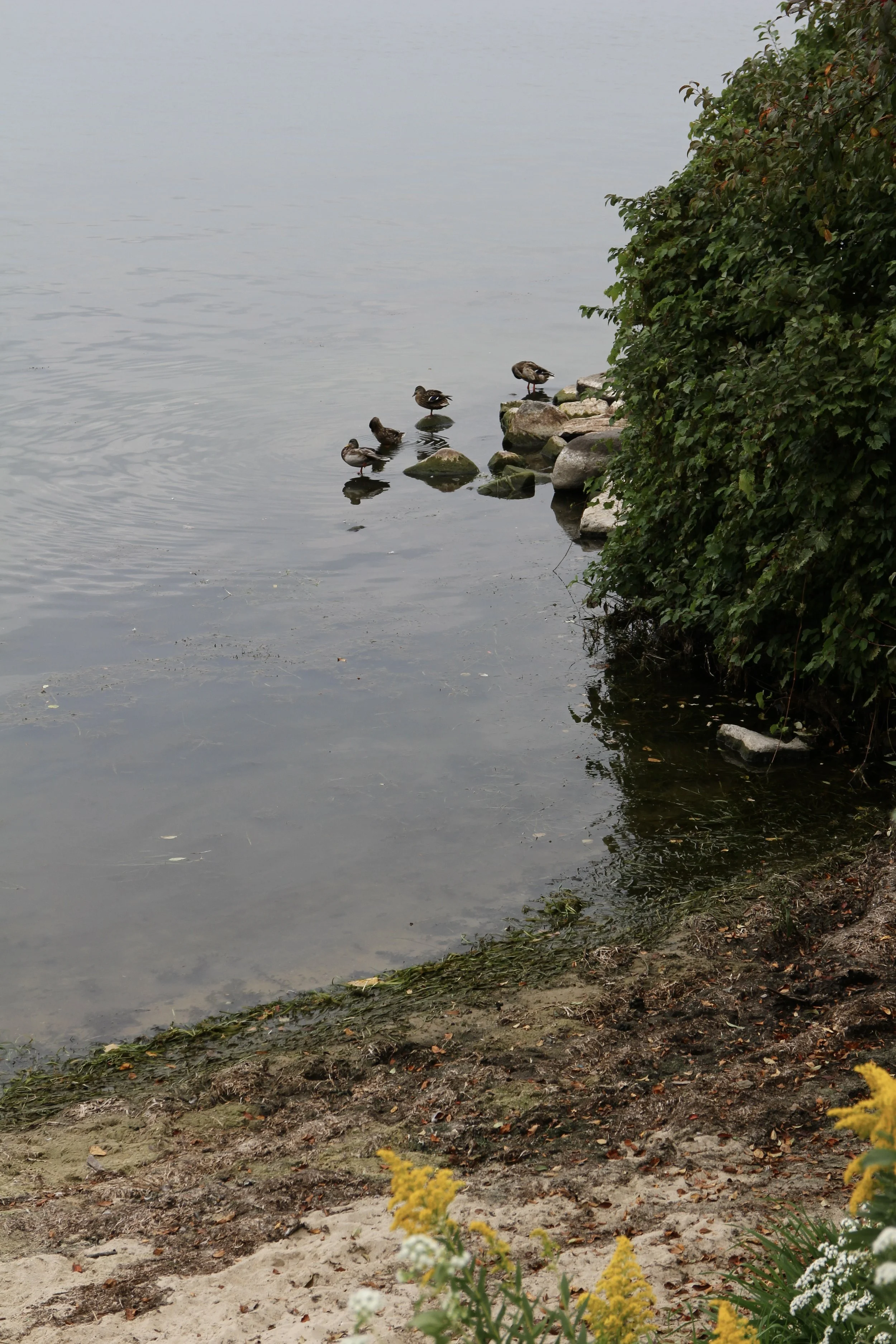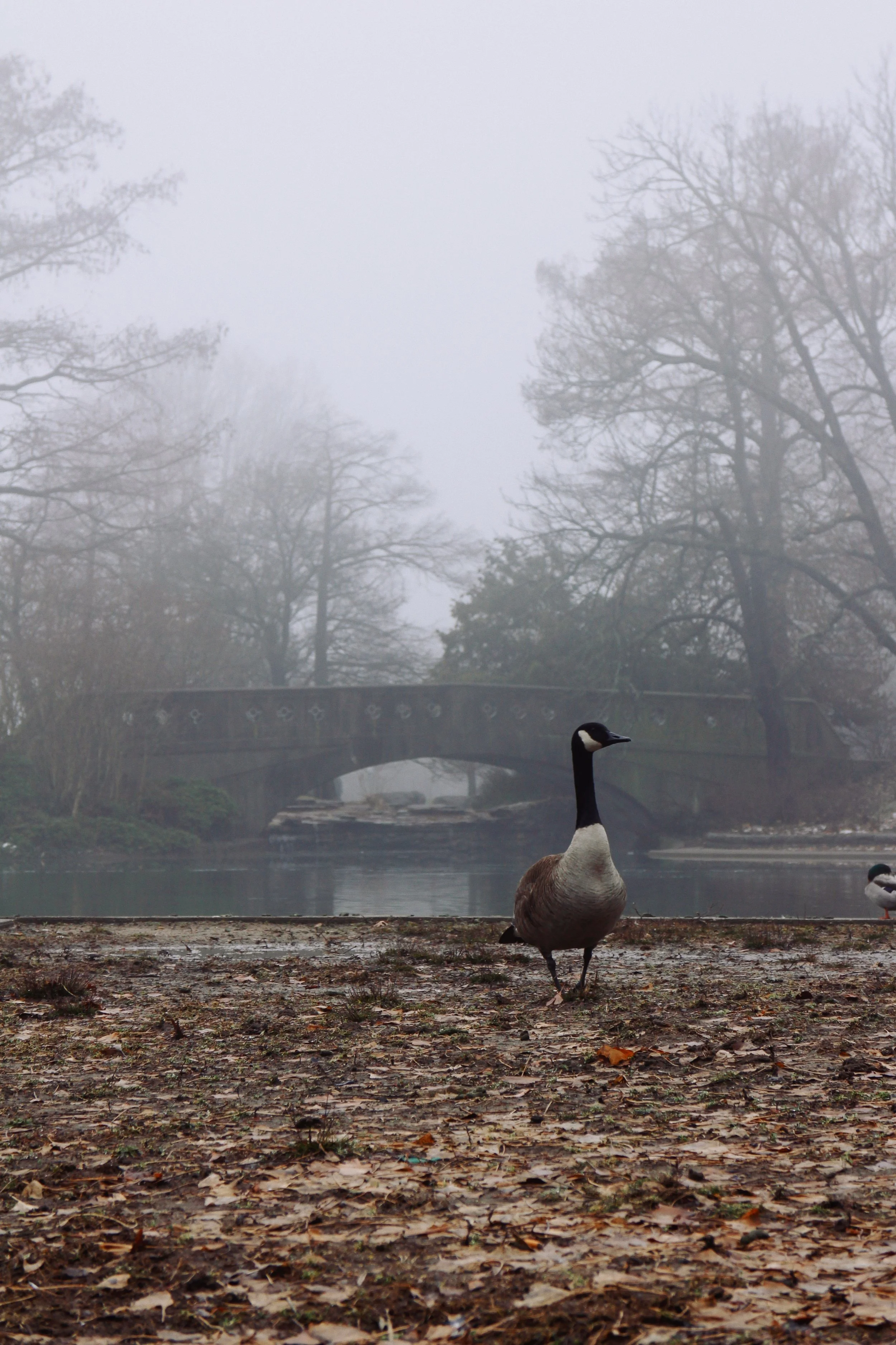 A Canada goose standing on a leaf-covered ground near a body of water, with a foggy background that includes a bridge and leafless trees.