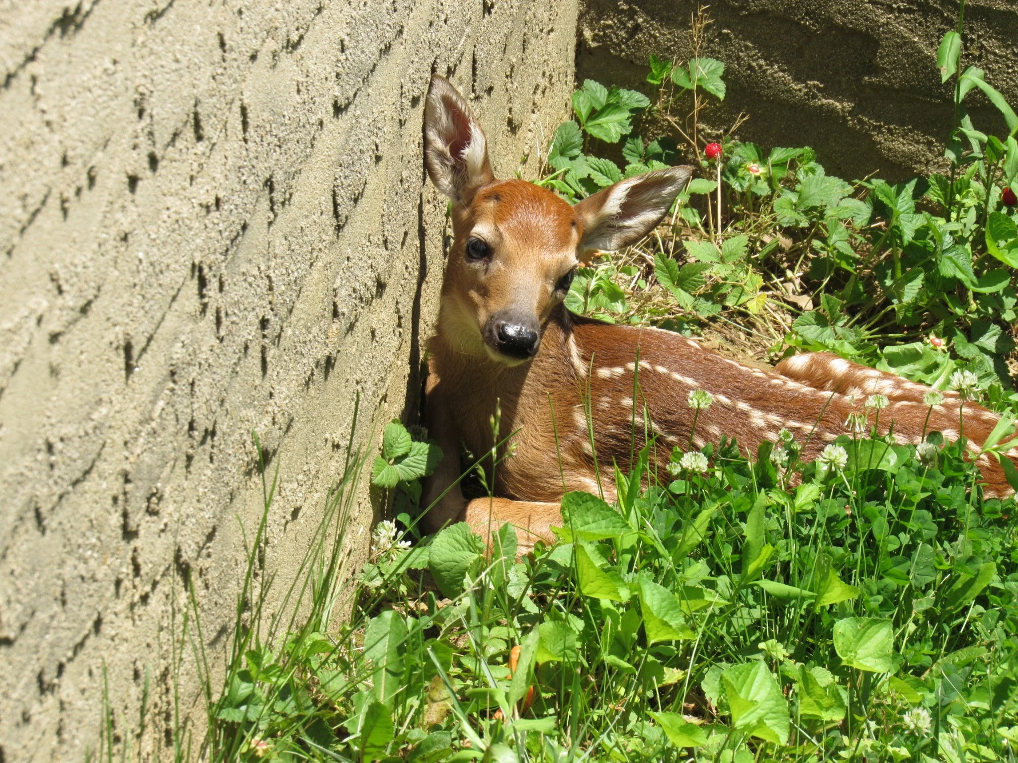 A fawn lies next to a wall surrounded by green plants and small white flowers, looking towards the camera.