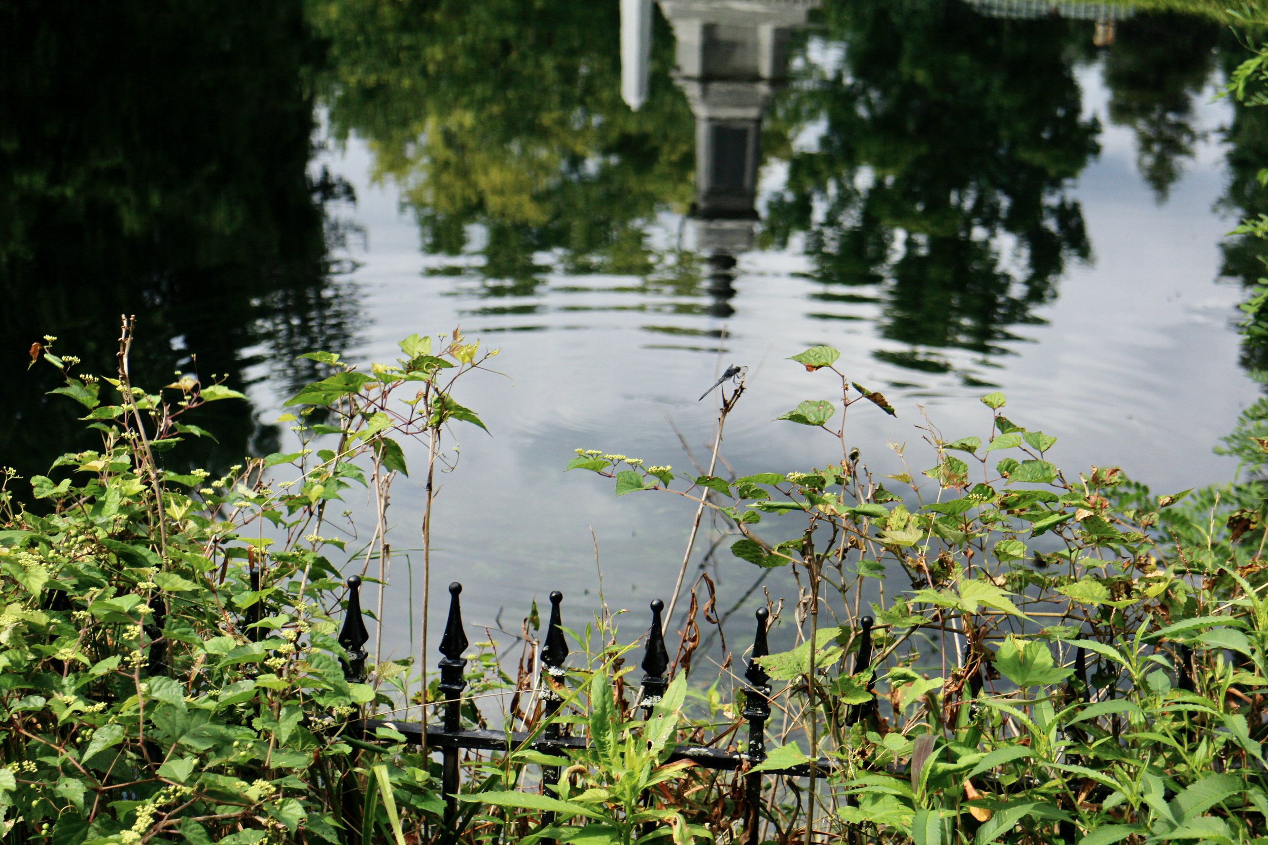 Black and white photo of a foggy yard with leafless trees and water reflecting the trees.